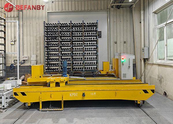 ट्रांसफर ट्रॉली दो ट्रॉली से बनी होती हैः शीर्ष ट्रॉली और निचली ट्रॉली, और उन दो ट्रॉली की चलती दिशा ऊर्ध्वाधर होती है। निचली ट्रॉली का उपयोग एनीलिंग फर्नेस को जोड़ने के लिए किया जाता है,नीचे ट्रॉली रेल वे पलट दिया जाता है के बाद annealing भट्ठी में रेल के साथ जुड़े हुए हैं. ऊपर की ट्रॉली पर घुमाया गया हाथ, जिसका उपयोग भट्ठी में उपकरण को धकेलने और खींचने के लिए किया जाता है। डिजाइन उच्च तापमान से विद्युत के नुकसान से बच सकता है।मोबाइल रेल और मोबाइल पलटने वाली बांह स्वचालित रूप से कनेक्ट कर सकते हैं, जो उत्पादन दक्षता में काफी वृद्धि कर रहा है।